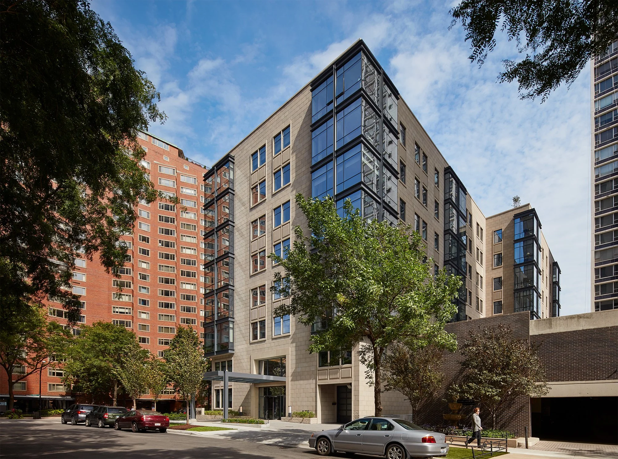 Located along Lake Shore Drive in Chicago’s Gold Coast, 61 Banks Street development emphasizes visual connectivity to the lake. The neighborhood is distinguished by prominent and enduring residential architecture, often built of stone and brick. This development expands on that theme, punctuating its stone façade with modernist steel and glass bays. These bays contain living rooms and shared spaces in each unit, framing uninterrupted views of Lake Michigan.