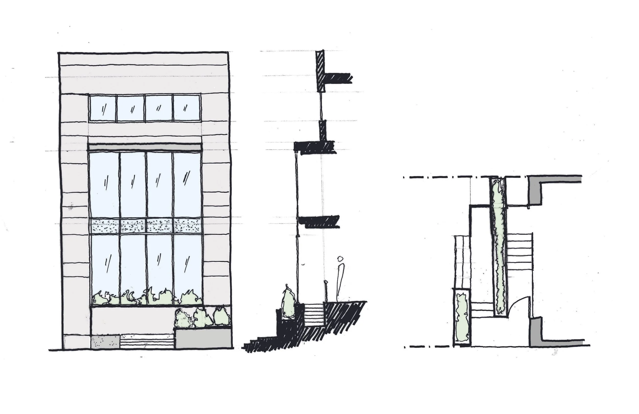A terrace and garden on the roof becomes a retreat from the busy street. Skylights pierce through the vegetation as sculptural elements