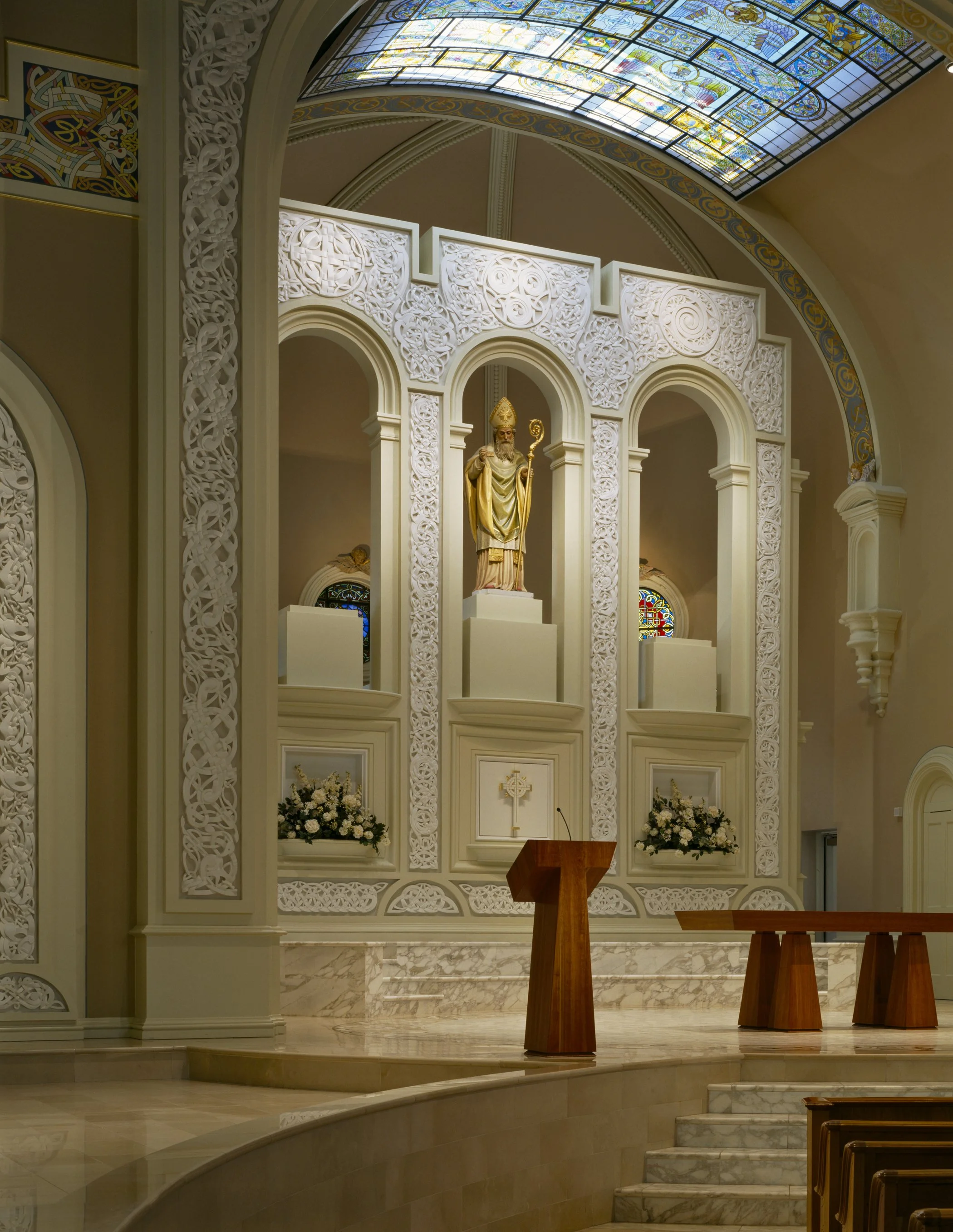The existing 19th century Italianate sacristy and its extant ad apsidem altar seemed contradictory to both the project’s celebration of Celtic heritage and contemporary Catholic worship. Accordingly, Booth Hansen proposed a new sacristy which preserved the original on its backside and featured intricate plaster knotwork facing the sanctuary.