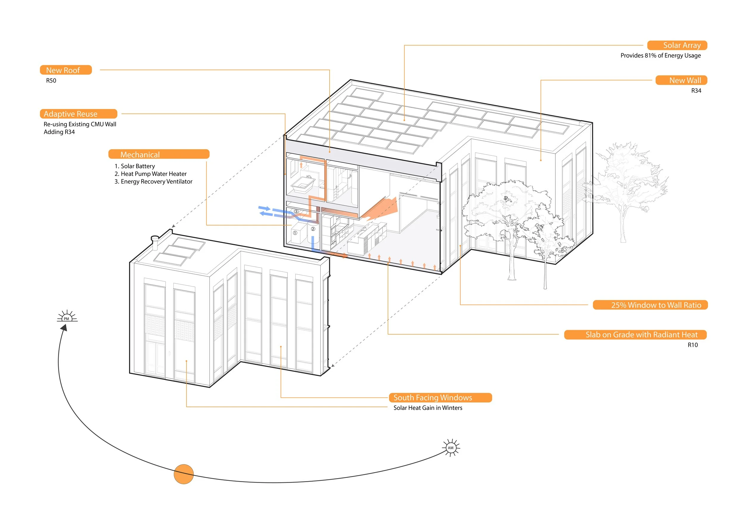 Situated on a triangular corner site with a frontage that spans 150 ft, this all-electric, nearly net-zero, two-story, single-family residence takes its shape from the outline left from a previous home’s foundation. Its three distinct volumes define public and private interiors, each facing intimate gardens at the building’s perimeter.