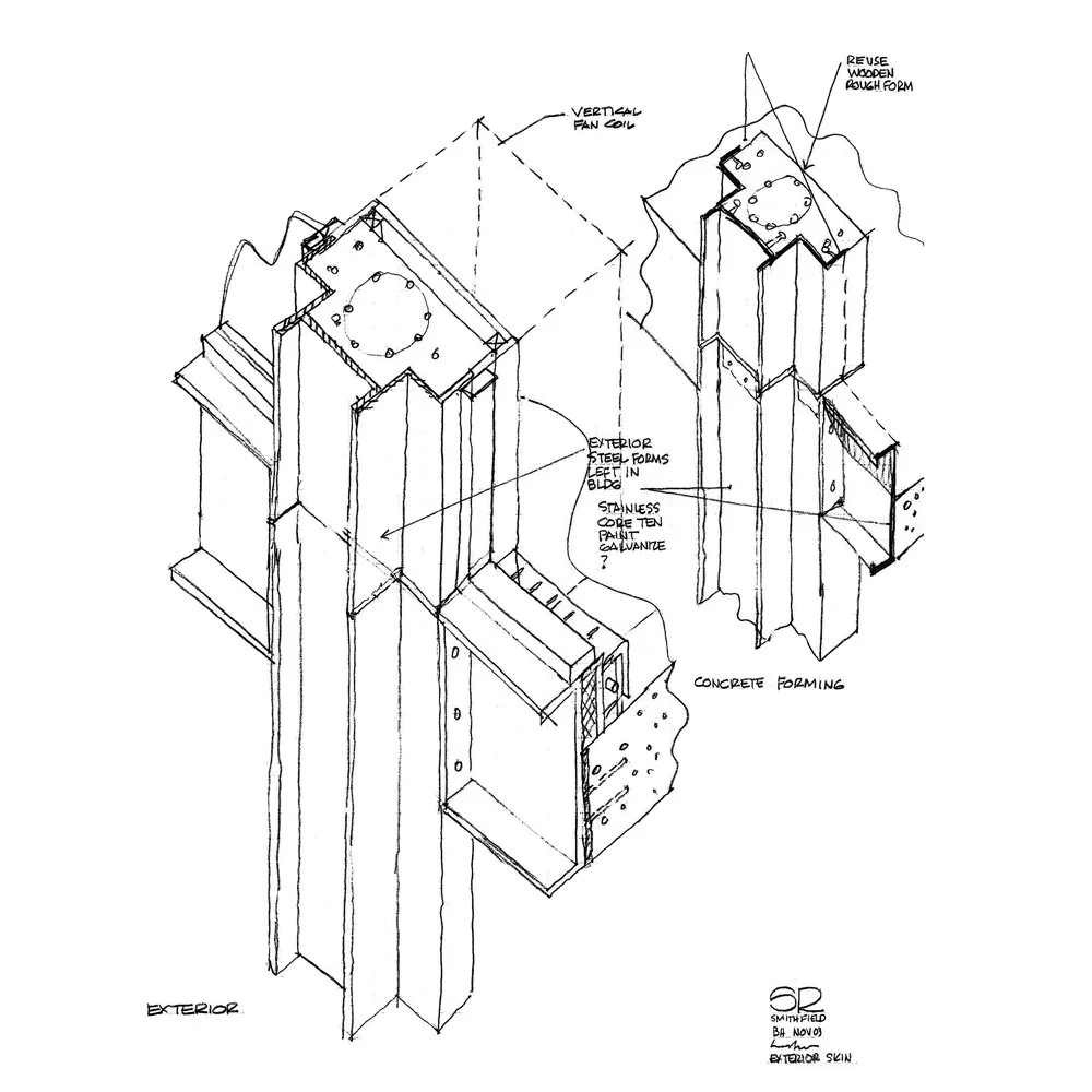 A slim concrete floor slab and elegant structural engineering allow for tall ceilings within the units; the prefabricated window walls that form the façade provide generous daylighting. Steel framing used in the concrete slab formwork remains integrated into the façade, an expression of the efficient construction method.