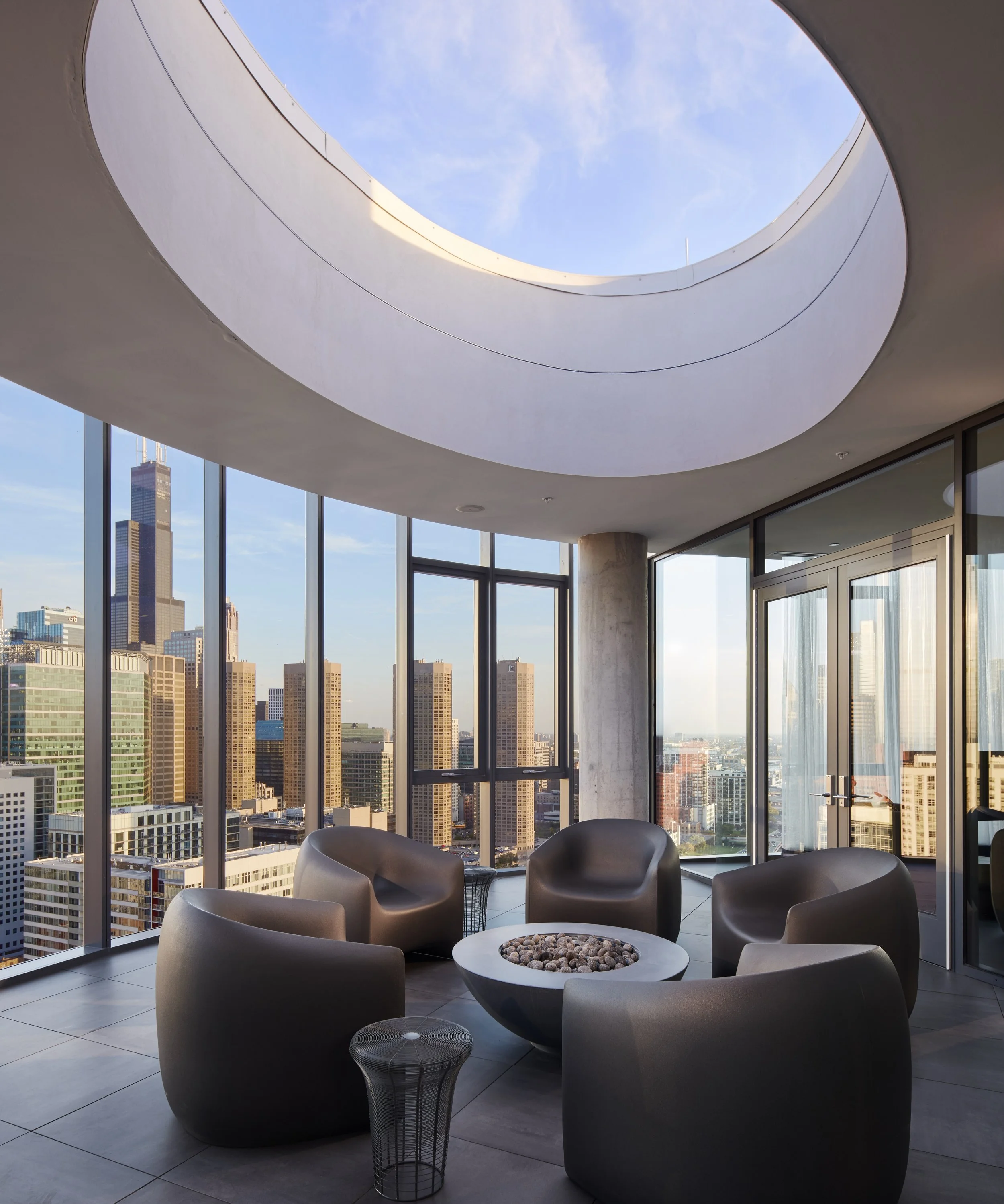 By orienting the tower on an east-west axis the plan takes advantage of Lake Michigan’s shoreline angle, providing panoramic lakefront and downtown views to the majority of residents. The curved shape augments this expansive view. Patterned glass slab spandrels contrast with the windows and accentuate the tower’s geometry. This detail extends to the balcony railings and perforated metal panels on the garage, referencing the industrial aesthetic of the Fulton Market District.