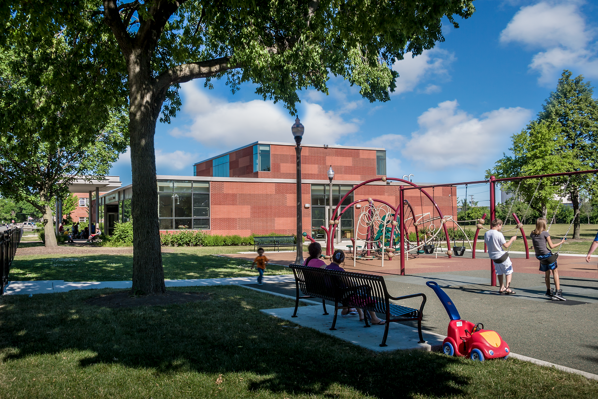 This prototype houses a gymnasium, two clubrooms, a fitness room, and administrative support. Booth Hansen developed a simple, classic form using patterned masonry and exposed steel, with a compact plan that allows views from the glazed entry through the building to the park beyond.
